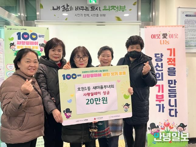 안녕일보 배윤 기자 | 의정부시 호원1동주민센터는 12월 18일 호원1동 새마을부녀회가 관내 어려운 이웃을 위해 ‘100일간 사랑릴레이 배턴 잇기’에 동참해 성금 20만 원을 기탁했다고 밝혔다.