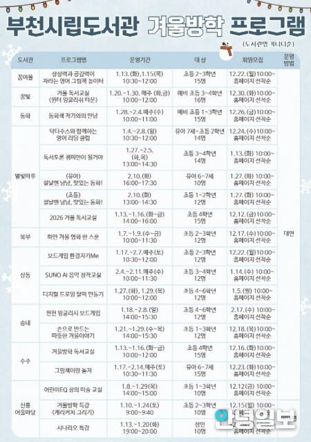 안녕일보 배윤 기자 | 부천시는 겨울방학을 맞아 내년 1월부터 2월까지 부천시립도서관에서 전 연령을 대상으로 독서문화 프로그램과 행사를 운영한다고 30일 밝혔다. 이번 프로그램은 연령과 관심사에 따라 다양한 참여 기회를 제공하기 위해 마련됐다.