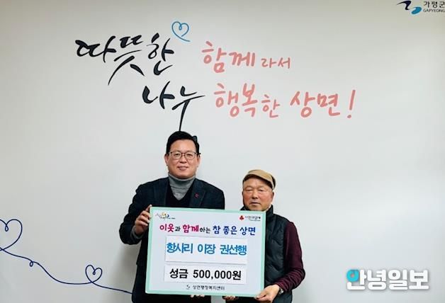 안녕일보 배윤 기자 | 매년 성금 기부를 통해 나눔을 실천해 온 가평군 상면 항사리 권선행 이장이 올해도 변함없이 상면 행정복지센터에 성금 50만원을 기탁했다.