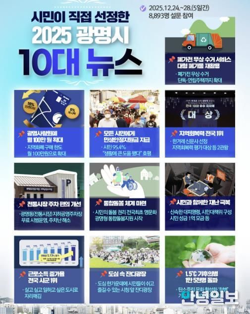 안녕일보 배윤 기자 | #광명시민이 직접 뽑은 2025년 10대 뉴스의 한 줄 평은 ‘위기 속에서도 흔들리지 않는 지속가능한 광명’이다. 고물가와 경기 둔화, 기후위기와 안전 불안이 이어진 한 해 속에서 광명시는 단기 성과보다 도시가 오래 버틸 수 있는 힘을 키우는 데 시정의 중심을 뒀다. 민생경제 대응부터 탄소중립, 돌봄·안전·공동체를 아우르는 구조적 변화까지 이어진 시정의 방향은 시민이 선정한 10대 뉴스에 고스란히 담겼다. 이는 2025년 광명시가 무엇에 집중했고, 어떤 기반을 다져왔는지를 분명히 보여준다.