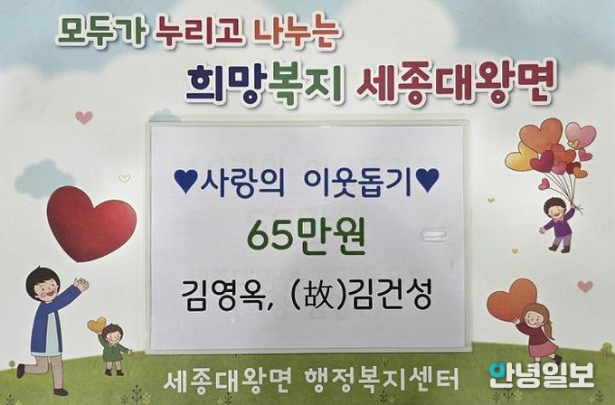 안녕일보 배윤 기자 | 지난 29일 세종대왕면 구양리에 거주하는 김영옥, (故)김건성께서 관내 어려운 이웃을 위한 성금 65만원을 세종대왕면 지역사회보장협의체에 기탁했다.