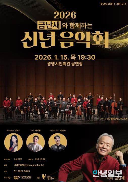 안녕일보 배윤 기자 | (재)광명문화재단은 2026년 새해를 맞아 지휘자 금난새와 뉴월드 필하모닉 오케스트라가 함께하는 ‘금난새와 함께하는 '신년 음악회'’를 오는 1월 15일 오후 7시 30분, 광명시민회관 공연장에서 개최한다.