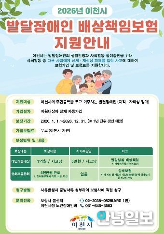안녕일보 배윤 기자 | 이천시는 2026년 1월 1일부터 경기도 최초로 발달장애인을 위한 배상책임보험 가입 지원을 시행한다고 밝혔다.