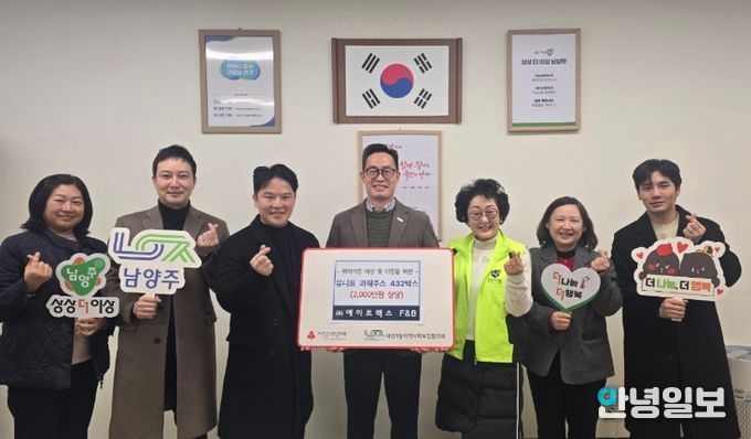 안녕일보 배윤 기자 | 남양주시는 30일 다산행정복지센터에서 ㈜에이트랙스 에프앤비가 지역 아동을 위한 과채주스 432박스를 전달했다고 밝혔다.