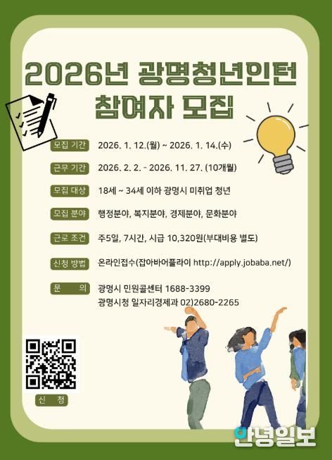 안녕일보 배윤 기자 | 광명시가 오는 12일부터 14일까지 ‘2026년 상반기 청년 일자리 사업’ 참여자 103명을 모집한다.