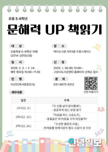 안녕일보 배윤 기자 | 고양특례시 덕이도서관은 2026년 겨울방학을 맞아 아동과 청소년을 대상으로 한 독서·글쓰기 프로그램을 운영한다.