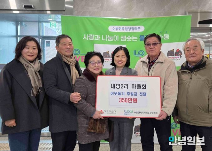 한편, 수동면 내방2리 마을회는 지난 2021년부터 지역사회 복지증진을 위해 꾸준히 후원금을 전달하는 등 나눔 문화 확산에 기여하고 있다.