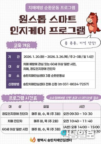안녕일보 배윤 기자 | 평택시 송탄치매안심센터에서는 치매 예방 및 인지기능 향상을 위한 ‘원스톱 스마트 인지케어 프로그램’ 1기 참여자를 오는 14일까지 모집한다.