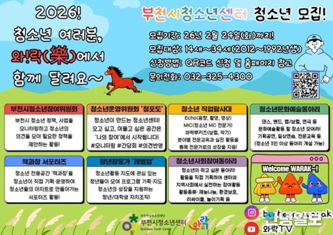 안녕일보 배윤 기자 | 부천여성청소년재단이 운영하는 부천시청소년센터는 2026년 청소년 참여자치조직 및 동아리 활동에 참여할 청소년·청년을 모집한다. 부천시청소년센터는 청소년의 자치 역량 강화와 주도적 참여 확대를 위해 참여, 문화예술, 진로직업탐색 등 다양한 활동을 운영하고 있다.