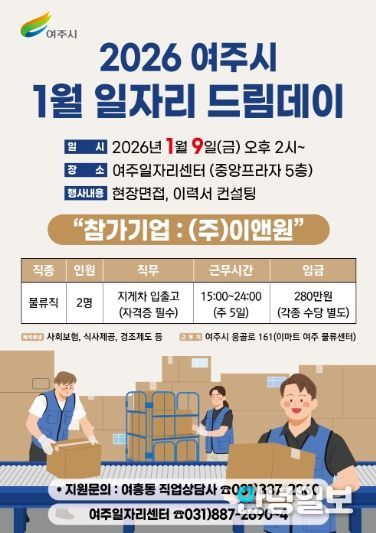 안녕일보 배윤 기자 | 여주시는 오는 1월 9일 오후 2시 여주일자리센터(세종로 14번길 18, 중앙프라자 5층)에서 ‘2025년 첫 여주시 일자리드림데이’를 연다.