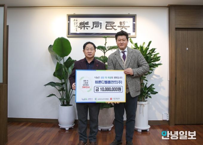 안녕일보 배윤 기자 | 남양주시는 5일 바른디벨롭먼트 주식회사가 지역 내 취약계층 지원을 위해 후원금 1천만 원을 남양주시복지재단에 기탁했다고 밝혔다.