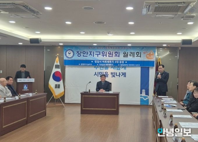 이날 회의에는 법무부 청소년 범죄예방위원 장안지구위원회 30여 명이 참석한 가운데, 2025년도 청소년 선도 캠페인을 포함한 주요 사업 및 활동 성과 보고를 진행했으며 2026년도 활동 계획과 지역사회 발전 방향에 대해 논의하는 시간을 가졌다.