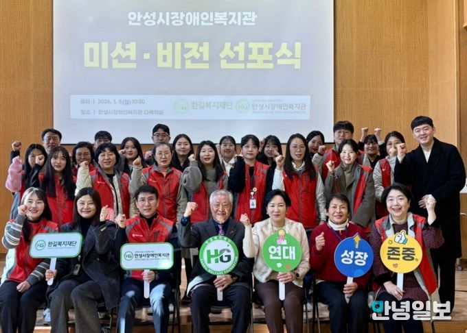 안녕일보 배윤 기자 | 사회복지법인 한길복지재단에서 수탁하고 있는 안성시장애인복지관은 지난 5일 직원과 복지관 이용자 대표 등이 참석한 가운데 향후 5개년(2026년~2030년)의 새로운 중장기계획을 발표하는 ‘미션·비전 선포식’을 개최했다.