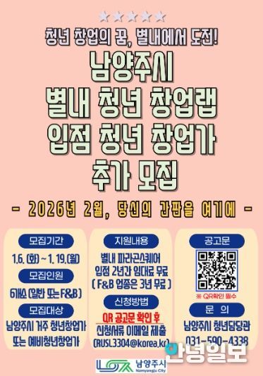 신청 기간은 1월 6일부터 1월 19일 오후 6시까지이며, 신청 희망자는 관련 서류를 남양주시 청년담당관 전자우편으로 제출하면 된다.