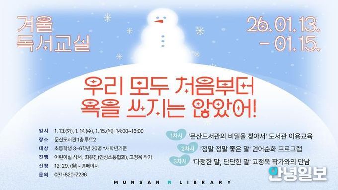안녕일보 배윤 기자 | 파주시 문산도서관은 오는 13일부터 15일까지 사흘간 2026년 문산도서관 겨울독서교실을 운영한다.
