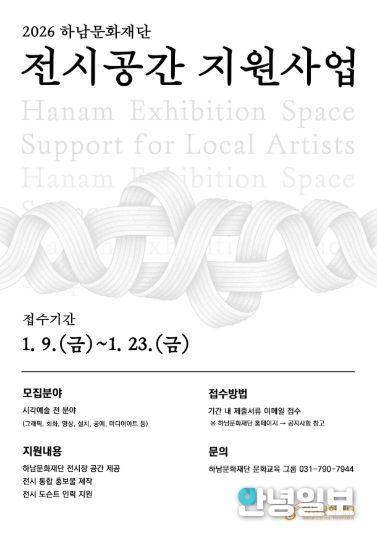안녕일보 배윤 기자 | (재)하남문화재단이 하남시를 기반으로 시각예술 분야에서 활동하는 지역 예술가를 지원하기 위해 '전시공간 지원사업' 참여 작가를 오는 23일까지 모집한다고 밝혔다.