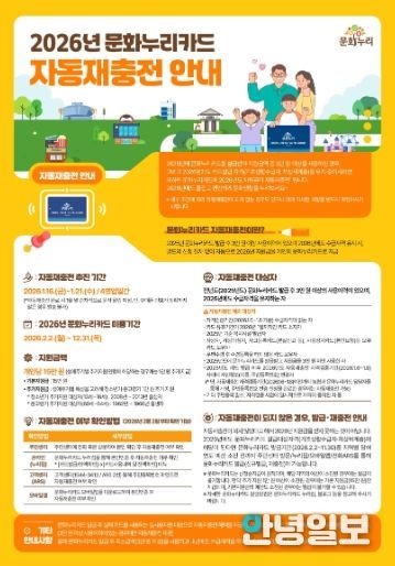 안녕일보 배윤 기자 | 김포시는 오는 1월 16일부터 21일까지 4영업일 간 2026년 문화누리카드 자동재충전을 실시한다고 밝혔다.