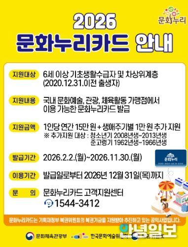 안녕일보 배윤 기자 | 정부 정책에 따라 2026년부터 통합문화이용권(문화누리카드)과 청년문화예술패스 제도가 개편된다. 이에 따라 양주시는 개편 기준에 맞춰 지역대상자를 대상으로 해당 사업을 확대 시행한다고 밝혔다.
