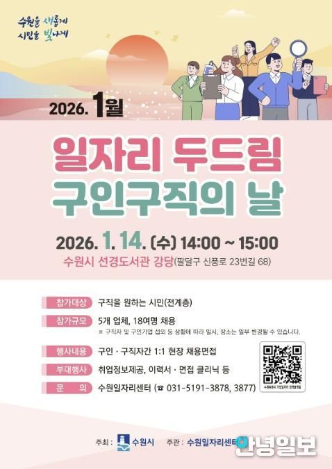 안녕일보 배윤 기자 | 수원특례시는 1월 14일 오후 2시부터 3시까지 선경도서관 강당에서 ‘1월 일자리 두드림 구인·구직의 날’ 채용 행사를 연다.