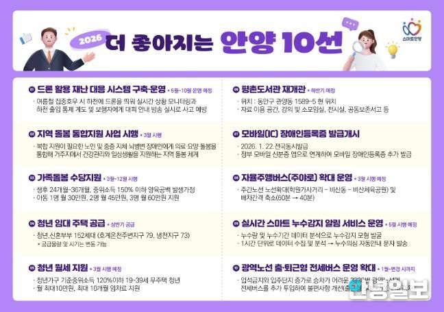 안양시(시장 최대호)는 ▲드론 활용 재난 대응시스템 구축·운영 ▲지역 돌봄 통합지원사업 시행 ▲가족돌봄수당 지원 ▲청년임대주택 공급 ▲안양시 청년월세 지원(사업대상 확대) ▲평촌도서관 재개관 등 ‘2026년 더 좋아지는 안양 10선’을 12일 소개했다.