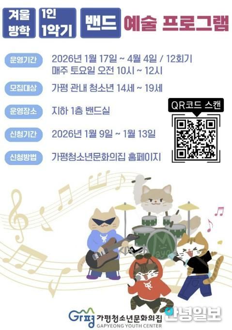 안녕일보 배윤 기자 | 가평청소년문화의집은 1월 9일부터 13일까지 ‘1인 1악기 밴드 프로그램’에 참여할 청소년을 모집한다고 12일 밝혔다.