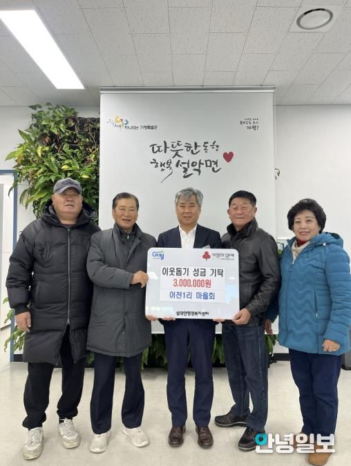 안치왕 이장은 “이번 성금으로 관내 어르신들이 추운 겨울을 조금이나마 따뜻하게 보내는 데 보탬이 되기를 바란다”며 “앞으로도 지역사회를 위해 할 수 있는 일들을 꾸준히 찾아 실천하겠다”고 말했다.