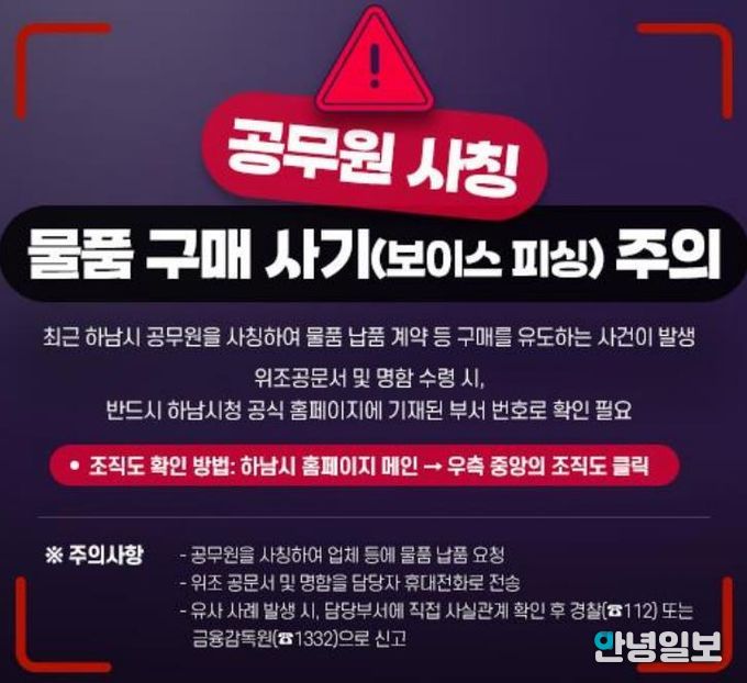 안녕일보 배윤 기자 | 하남시는 최근 공무원을 사칭하여 관내 중소기업과 소상공인, 시민들을 대상으로 한 범죄 사례가 지속적으로 발생함에 따라 각별한 주의가 필요하다고 밝혔다.