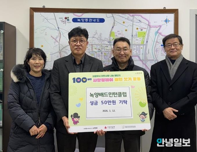안녕일보 배윤 기자 | 의정부시 녹양동주민센터는 1월 12일 녹양배드민턴클럽이 성금 50만 원을 기탁하며 ‘100일간 사랑릴레이 배턴 잇기’에 동참했다고 밝혔다.