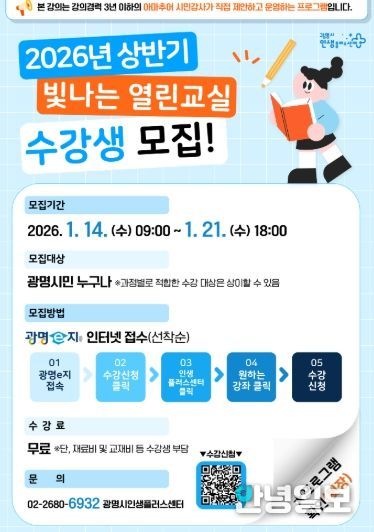 안녕일보 배윤 기자 | 광명시 인생플러스센터는 오는 14일부터 21일까지 시민이 기획하고 운영하는 ‘2026년 상반기 빛나는 열린교실’의 수강생 230명을 모집한다.