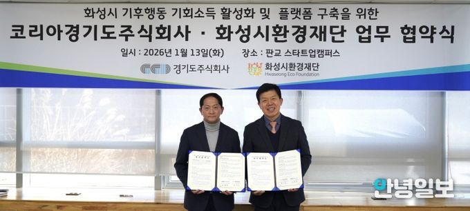 안녕일보 배윤 기자 | 경기도주식회사는 13일 경기도 성남시 판교 스타트업캠퍼스에서 화성시환경재단과 ‘기후행동 기회소득 활성화 및 화성시 플랫폼 구축을 위한 업무협약’을 체결했다.