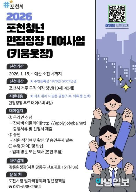 안녕일보 배윤 기자 | 포천시는 오는 15일부터 청년 구직·이직자를 위한 ‘포천 청년 면접정장 대여사업’을 운영한다.