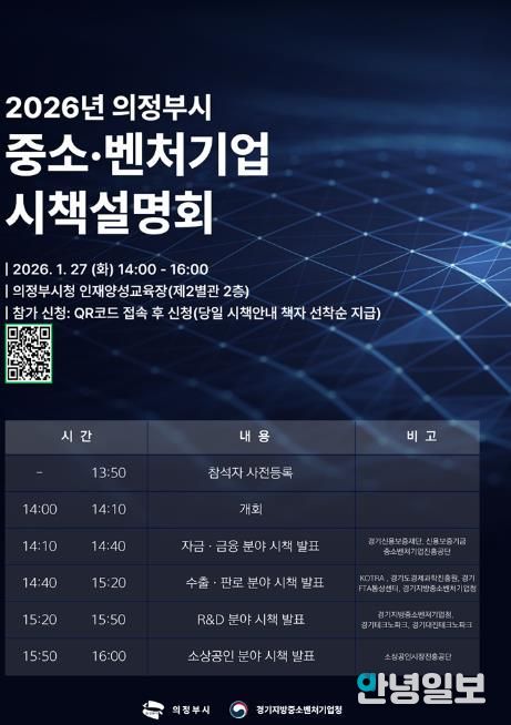안녕일보 배윤 기자 | 의정부시는 ‘2026년 중소‧벤처기업 시책설명회’에 참가할 지역 중소‧벤처기업인을 1월 26일까지 모집한다.