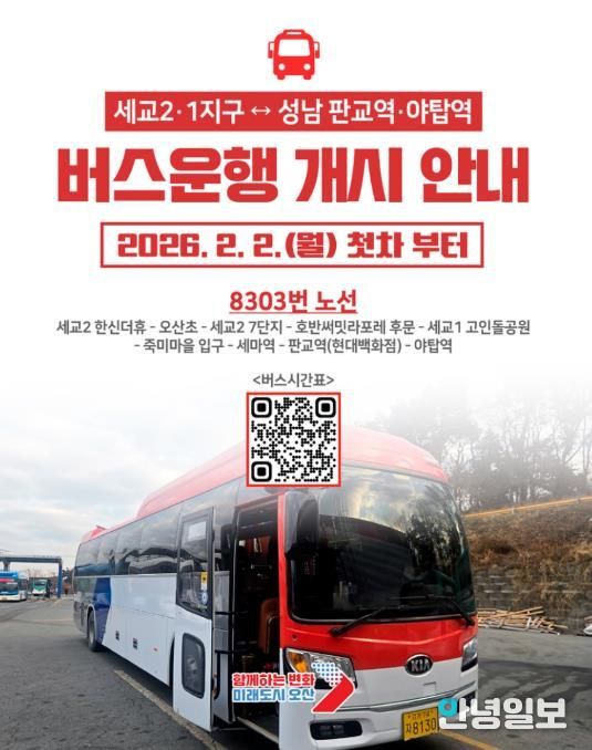 이번에 신설되는 8303번 버스는 하루 2대가 투입돼 총 8회 운행된다. 세교1·2지구를 비롯한 오산 주민들의 수도권 남부 이동 편의를 크게 높일 것으로 기대된다. 특히 성남 판교·야탑 방면 직행 노선에 대한 시민들의 지속적인 요구를 반영해 마련된 노선이라는 점에서 의미가 크다.