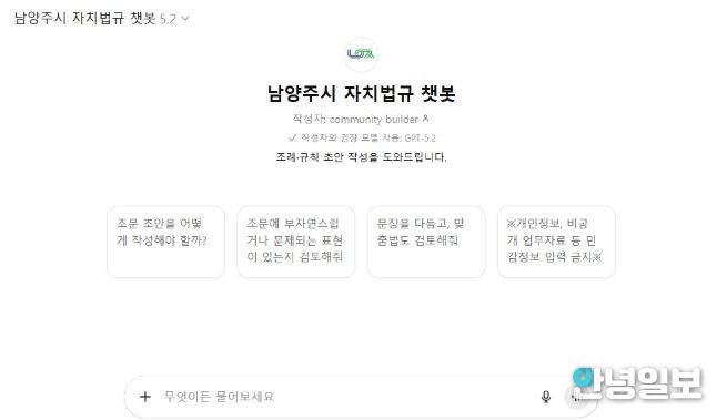 안녕일보 배윤 기자 | 남양주시는 이달부터 전 직원을 대상으로 자치법규 업무를 지원하는 생성형 인공지능(AI) 기반 ‘남양주시 자치법규 챗봇’ 운영을 시작했다고 14일 밝혔다.