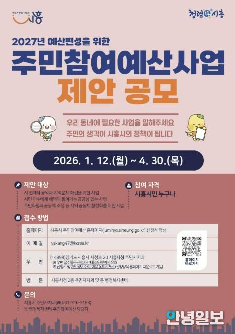 안녕일보 배윤 기자 | 시흥시는 오는 4월 30일까지 주민들이 직접 사업을 제안하는 ‘시흥시 주민참여예산 제안’을 신청받는다.