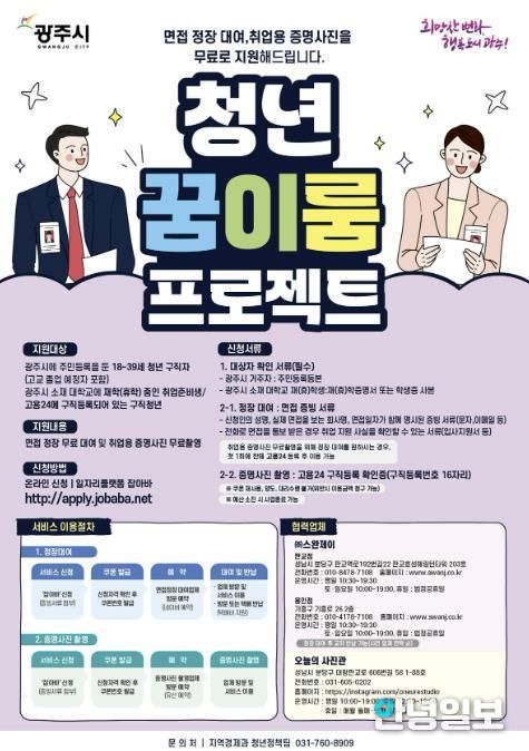 이번 사업은 광주시에 거주하거나 시 소재 대학에 재·휴학 중인 청년 구직자를 대상으로 하며 면접 정장 대여와 증명사진 촬영 비용을 전액 지원하는 것이 주요 내용이다.