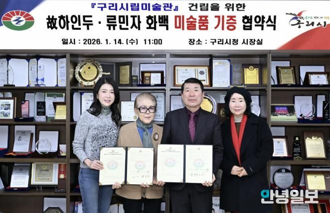 안녕일보 배윤 기자 | 구리시는 지난 14일 시청 3층 시장실에서 ‘구리시립미술관 건립을 위한 작품 기증 협약식’을 개최했다. 이번 협약식은 한국 현대미술사의 거장 고(故) 하인두 화백의 작품 80점과 류민자 화백의 작품 25점을 기증받고, 문화예술 교류 협력을 공식화하기 위해 마련됐다.