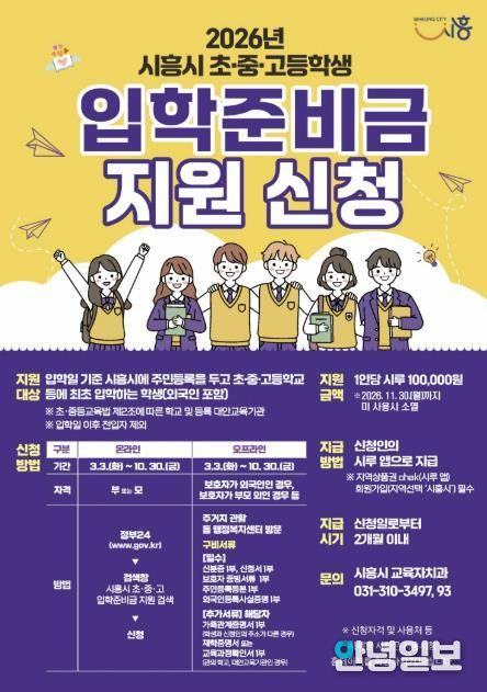안녕일보 배윤 기자 | 시흥시는 올해부터 관내 초중고 입학 자녀 가정에 입학준비금을 10만 원씩 지원한다. 이번 지원은 도서나 문구류 등을 새로 마련해야 하는 신입생 가정의 경제적 부담을 줄여주고, 교육 기본권을 강화하고자 추진됐다.