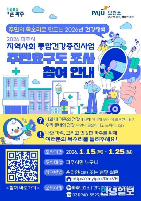 안녕일보 배윤 기자 | 파주시는 시민의 건강한 삶을 지원하기 위해 '2026년 지역사회 통합건강증진사업’추진에 앞서 주민건강요구도 조사를 실시한다.