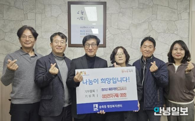 안녕일보 배윤 기자 | 수원시 장안구 송죽동은 지난 15일 삼성전자 구매OB회와 함께하는 ‘청소년 용돈지원사업’ 후원금 전달식을 개최했다고 밝혔다.