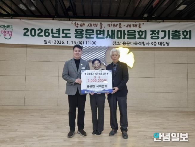 홍명기 용문면장은 “매년 변함없이 이웃사랑을 실천해 주시는 새마을회 회원 여러분께 깊이 감사드리며, 이러한 나눔이 어려운 이웃들에게 큰 힘과 희망이 되길 바란다”며 “기탁해 주신 소중한 성금은 도움이 꼭 필요한 분들을 위해 투명하고 공정하게 사용하겠다”고 전했다.