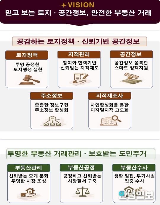 추진계획은 ▲투명하고 균형 잡힌 제도 운영으로 신뢰받는 토지행정 실현 ▲참여와 협력을 통한 신뢰받는 지적제도 정착 ▲공간정보 융·복합을 통한 스마트한 정책 지원 ▲촘촘한 주소정보 구현 및 주소정보 활성화 추진 ▲사업활성화를 통한 디지털지적 고도화 ▲신뢰받는 중개 문화와 투명한 부동산 시장 조성 ▲공정하고 신뢰받는 시장질서 구축 ▲생활밀접, 투기사범 집중수사 등 8대 전략을 바탕으로 한 92개 세부 이행과제로 구성됐다.