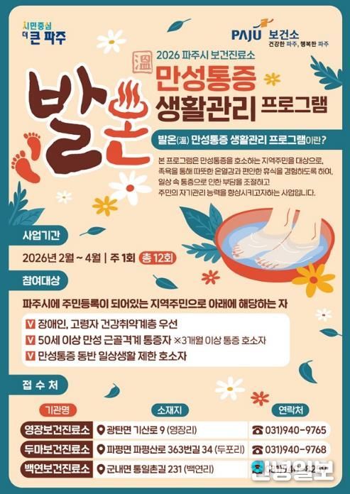 안녕일보 배윤 기자 | 파주시 보건진료소는 보건의료 취약지역 주민들의 건강증진을 위해 2026년 ‘발온(溫) 만성통증 생활관리’교실을 운영한다.