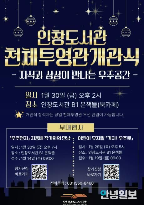 안녕일보 배윤 기자 | 구리시는 오는 1월 30일 오후 2시 인창도서관 지하 북카페에서 주요 내빈이 참석한 가운데 4층 야외에 조성된 인창도서관 천체투영관 개관식을 개최한다고 밝혔다.