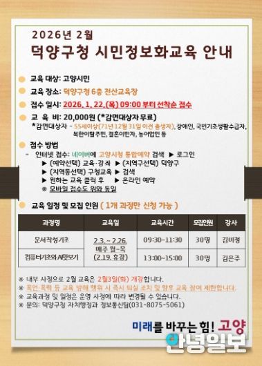 안녕일보 배윤 기자 | 고양특례시 덕양구는 고양시민의 디지털 역량 강화를 위해 ‘2026년 제1차 덕양구 시민정보화교육’ 수강생을 오는 22일부터 모집한다고 밝혔다.