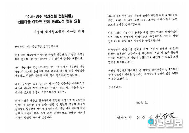 안녕일보 배윤 기자 | 성남시는 지난 16일 김윤덕 국토교통부 장관과 이성해 국가철도공단 이사장에게 ‘수서~광주 복선전철(이하 수광선) 건설사업’과 관련하여 여수동 산들마을 아파트 인접 통과 구간의 노선 변경을 요청하는 서한을 전달했다고 20일 밝혔다.