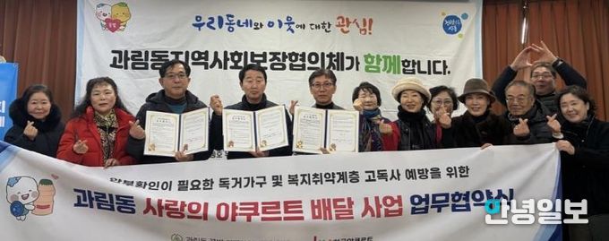 안녕일보 배윤 기자 | 시흥시 과림동 지역사회보장협의체는 지난 1월 19일 ㈜한국야쿠르트 역곡점과 복지 취약계층 안부 확인을 위한 ‘사랑의 요구르트 배달’ 사업 추진 업무협약을 체결했다.