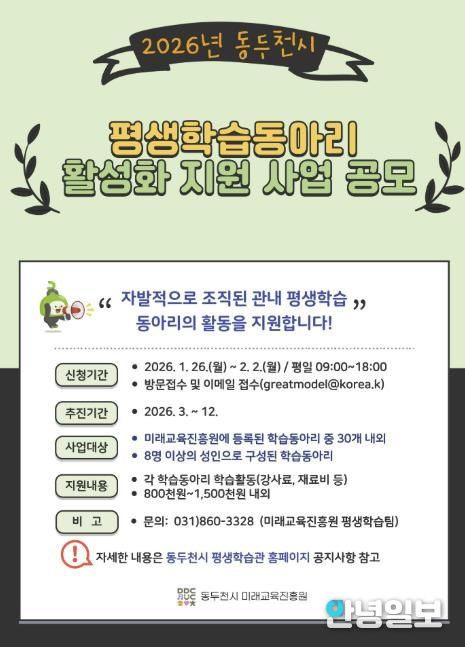 안녕일보 배윤 기자 | 동두천시는 오는 1월 26일부터 2월 2일까지, 시민 주도형 평생학습 문화 확산을 위해 ‘2026년 평생학습 동아리 활성화 지원사업’에 참여할 학습동아리를 모집한다고 밝혔다.