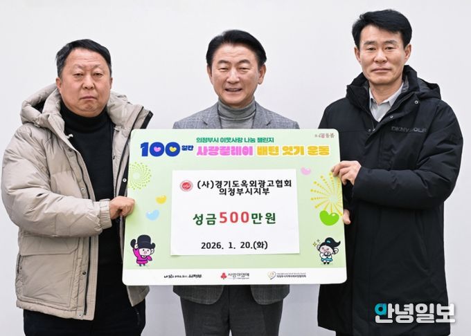 안녕일보 배윤 기자 | 의정부시는 1월 20일 (사)경기도옥외광고협회 의정부시지부가 ‘100일간 사랑릴레이 배턴 잇기’에 동참해 성금 500만 원을 기탁했다고 밝혔다.