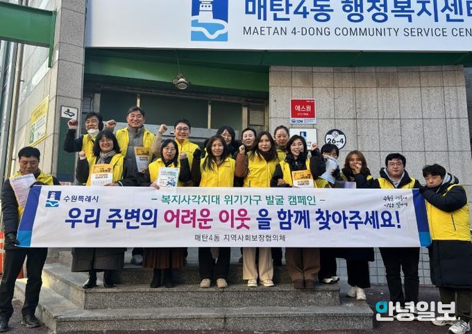 오미숙 매탄4동장은 “매탄4동 행정복지센터는 앞으로도 지속적인 위기가구 발굴 활동을 통해 동절기 복지 안전망 구축에 힘쓰겠다”며 “추운 날씨에도 캠페인에 적극 참여해 주신 지역사회보장협의체 위원님들께 감사드린다”고 밝혔다.